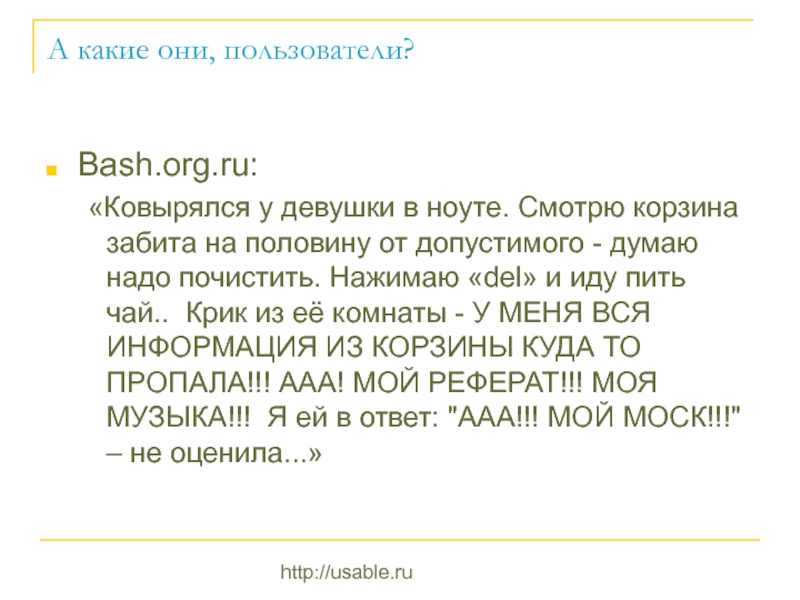 на половину от допустимого - думаю надо почистить. Нажимаю «del» и иду пить чай.. Крик из её комнаты - У МЕНЯ ВСЯ ИНФОРМАЦИЯ ИЗ КОРЗИНЫ КУДА ТО ПРОПАЛА!!! ААА! МОЙ РЕФЕРАТ!!! МОЯ МУЗЫКА!!! Я ей в ответ: "ААА!!! МОЙ МОСК!!!" – не оценила...»