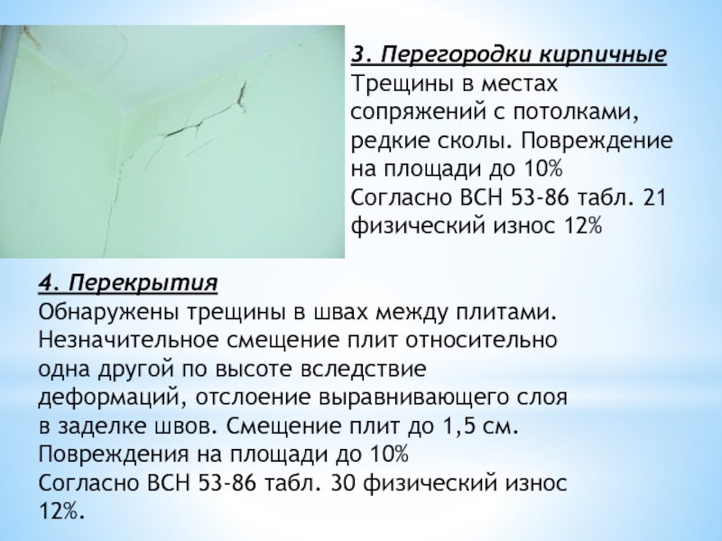 -Ширина раскрытия трещин до 2 мм, глубина до 1/3 толщины стены, разрушение швов на глубину до 1 см на площади до 10%