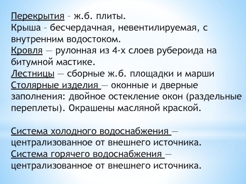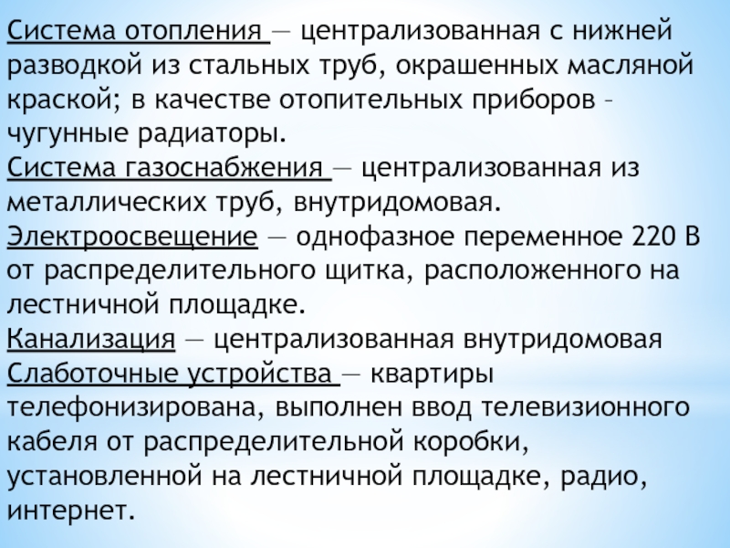 Слайд 5Система отопления — централизованная с нижней разводкой из стальных труб, окрашенных