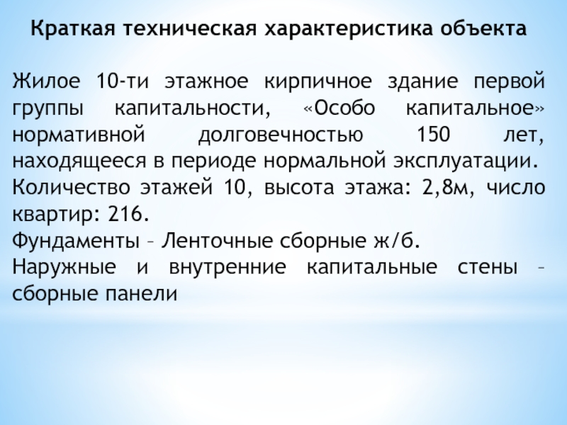 «Особо капитальное» нормативной долговечностью 150 лет, находящееся в периоде нормальной эксплуатации.