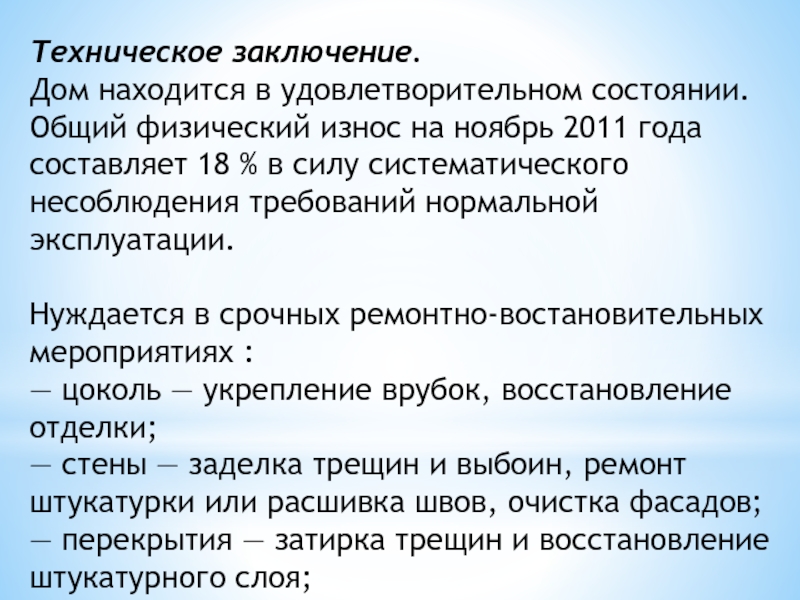 Дом находится в удовлетворительном состоянии. Общий физический износ на ноябрь