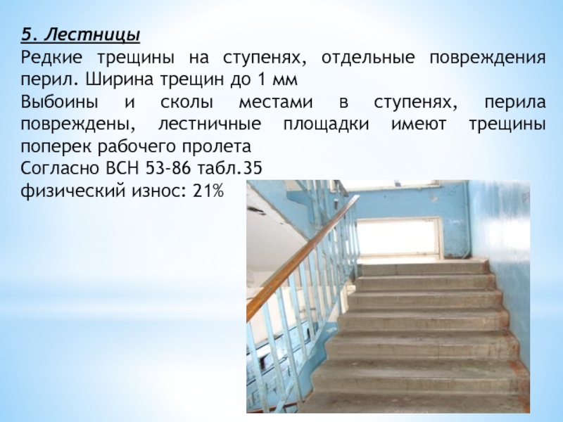 Редкие трещины на ступенях, отдельные повреждения перил. Ширина трещин до