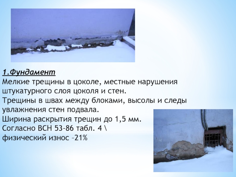 Мелкие трещины в цоколе, местные нарушения штукатурного слоя цоколя и стен.