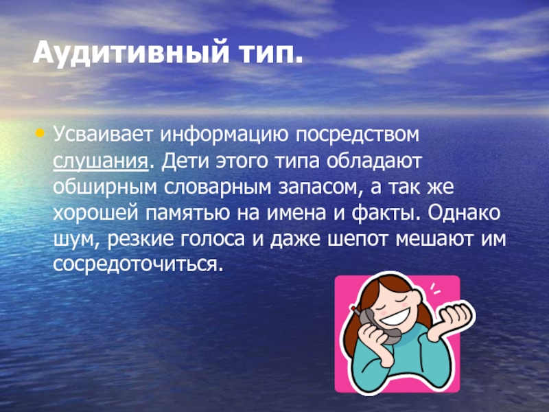 Усваивает информацию посредством слушания. Дети этого типа обладают обширным