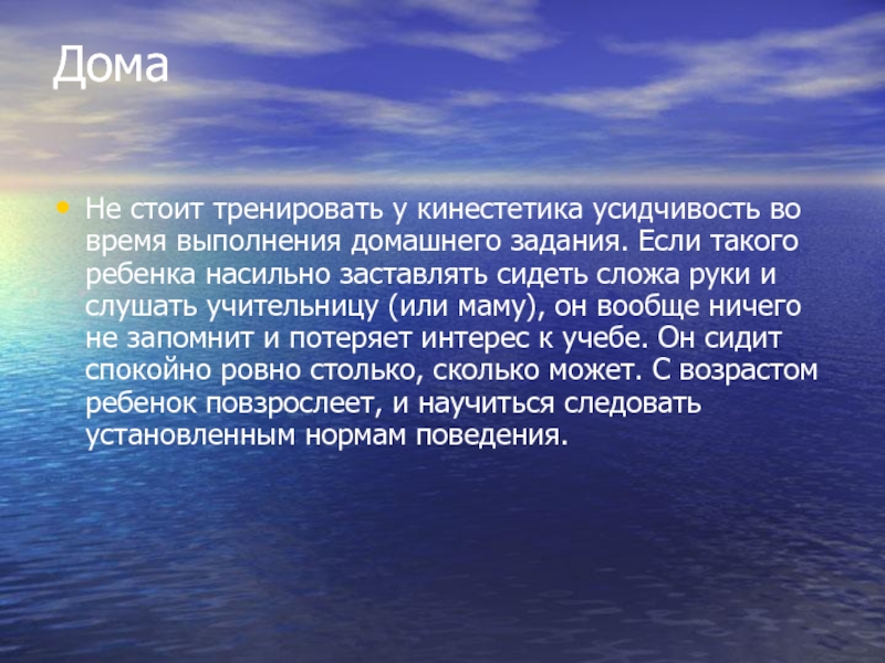 Не стоит тренировать у кинестетика усидчивость во время выполнения домашнего задания.