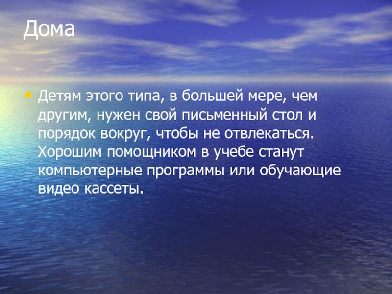 стол и порядок вокруг, чтобы не отвлекаться. Хорошим помощником в учебе станут компьютерные программы или обучающие видео кассеты.