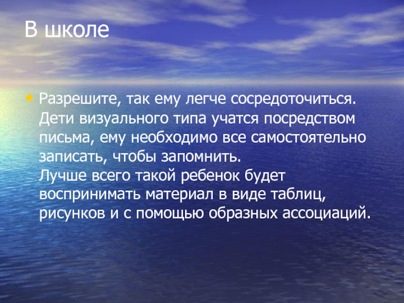 Лучше всего такой ребенок будет воспринимать материал в виде таблиц, рисунков и с помощью образных ассоциаций.