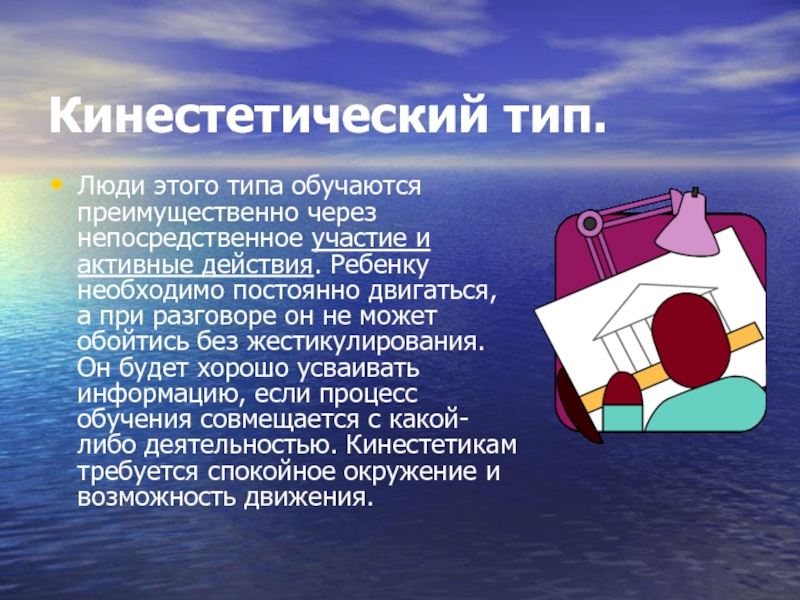 активные действия. Ребенку необходимо постоянно двигаться, а при разговоре он не может обойтись без жестикулирования. Он будет хорошо усваивать информацию, если процесс обучения совмещается с какой-либо деятельностью. Кинестетикам требуется спокойное окружение и возможность движения.