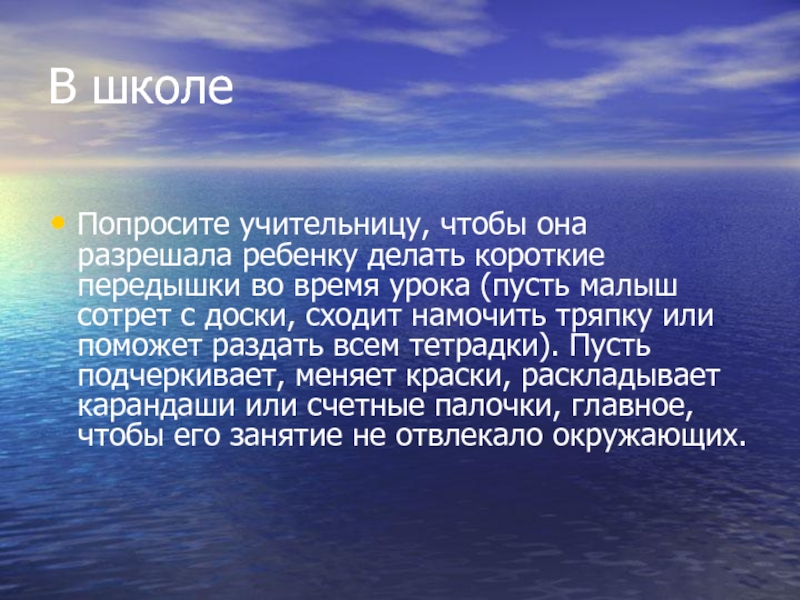 время урока (пусть малыш сотрет с доски, сходит намочить тряпку или поможет раздать всем тетрадки). Пусть подчеркивает, меняет краски, раскладывает карандаши или счетные палочки, главное, чтобы его занятие не отвлекало окружающих.