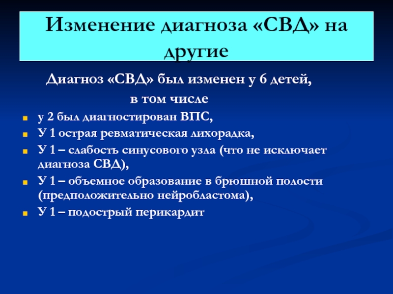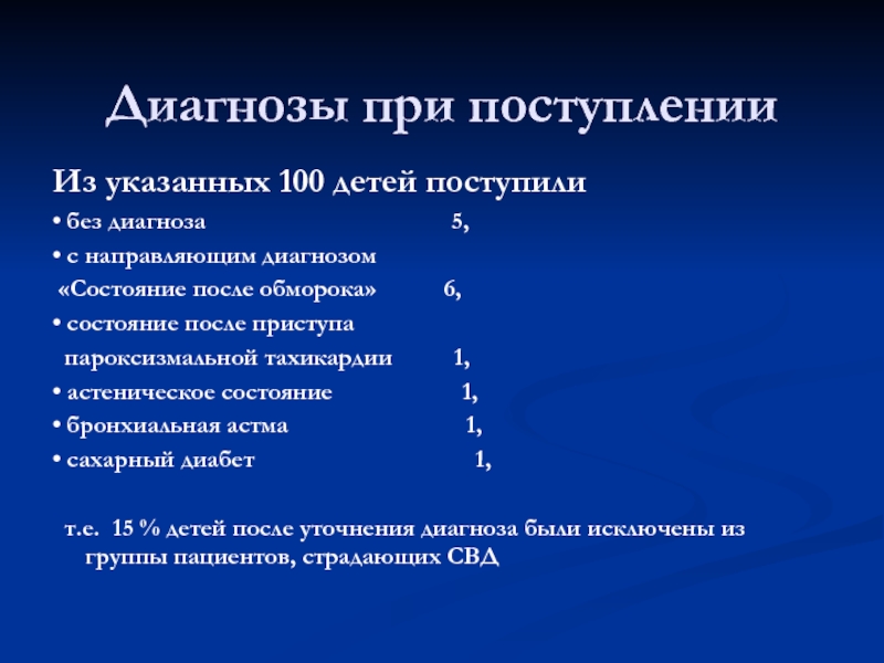 т.е. 15 % детей после уточнения диагноза были исключены из группы пациентов, страдающих СВД