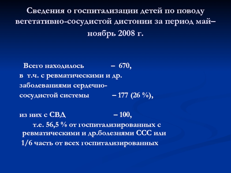 Слайд 39Сведения о госпитализации детей по поводу вегетативно-сосудистой дистонии за период май–ноябрь