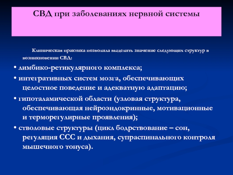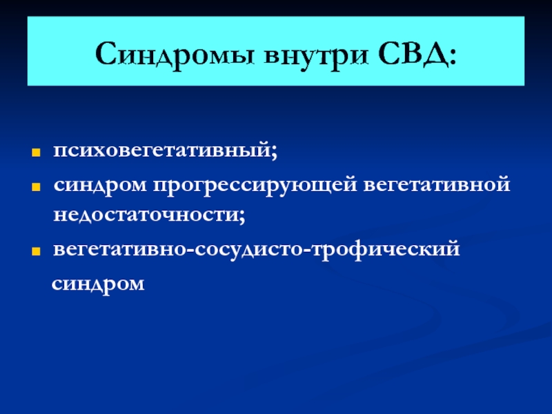 состояние синдромом вегетативной дистонии (СВД). Этот термин позволяет говорить о синдроме вегетативно-висцеральной дистонии. Последняя же может быть разделена на многообразные системные дистонии.
