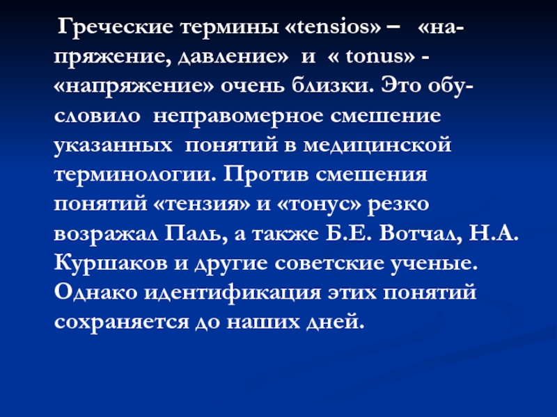 tonus» - «напряжение» очень близки. Это обу-словило неправомерное смешение указанных понятий в медицинской терминологии. Против смешения понятий «тензия» и «тонус» резко возражал Паль, а также Б.Е. Вотчал, Н.А. Куршаков и другие советские ученые. Однако идентификация этих понятий сохраняется до наших дней.