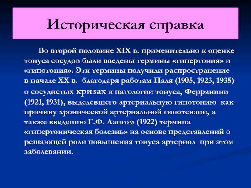 половине XIX в. применительно к оценке тонуса сосудов были введены термины «гипертония» и «гипотония». Эти термины получили распространение в начале ХХ в. благодаря работам Паля (1905, 1923, 1935) о сосудистых кризах и патологии тонуса, Ферранини (1921, 1931), выделевшего артериальную гипотонию как причину хронической артериальной гипотензии, а также введению Г.Ф. Лангом (1922) термина «гипертоническая болезнь» на основе представлений о решающей роли повышения тонуса артериол при этом заболевании.