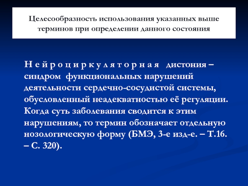 Н е й р о ц и р к у л я т о р н а я дистония – синдром функциональных нарушений деятельности сердечно-сосудистой системы, обусловленный неадекватностью её регуляции. Когда суть заболевания сводится к этим нарушениям, то термин обозначает отдельную нозологическую форму (БМЭ, 3-е изд-е. – Т.16. – С. 320).