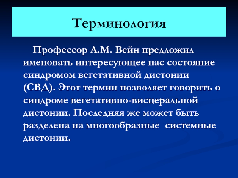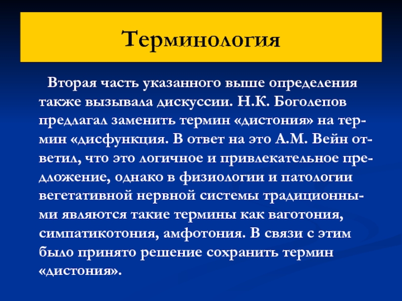 Н.К. Боголепов предлагал заменить термин «дистония» на тер-мин «дисфункция. В ответ на это А.М. Вейн от-ветил, что это логичное и привлекательное пре-дложение, однако в физиологии и патологии вегетативной нервной системы традиционны-ми являются такие термины как ваготония, симпатикотония, амфотония. В связи с этим было принято решение сохранить термин «дистония».