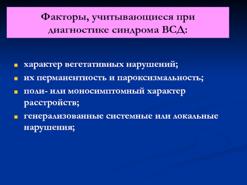 Слайд 10Факторы, учитывающиеся при диагностике синдрома ВСД: