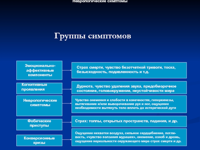 Ощущение нехватки воздуха, сильное сердцебиение, потли-вость, «чувство ползания мурашек», онемение, озноб и дрожь, ощущение нереальности окружающего мира страх смерти и др.