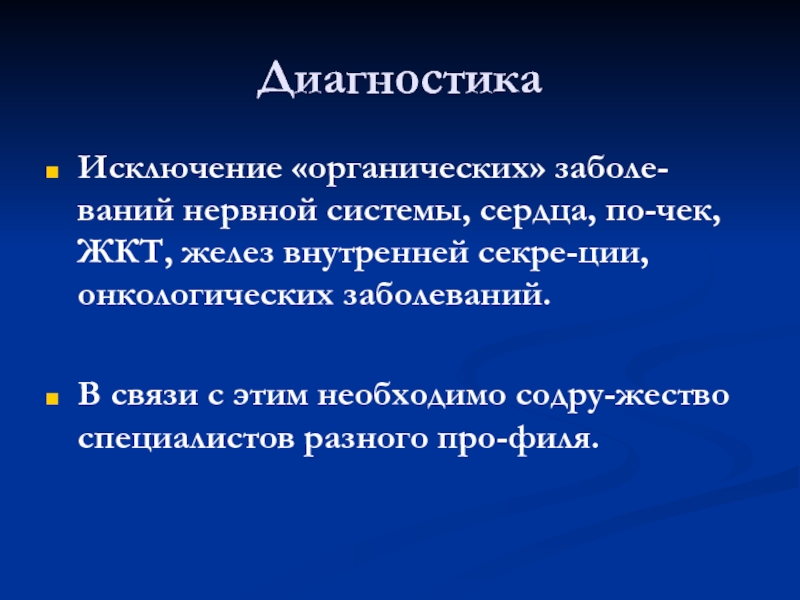 Исключение «органических» заболе-ваний нервной системы, сердца, по-чек, ЖКТ, желез внутренней секре-ции,