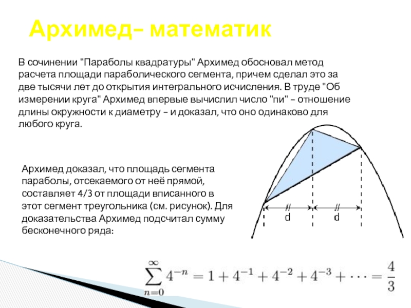 В сочинении "Параболы квадратуры" Архимед обосновал метод расчета площади параболического сегмента, причем сделал это за две тысячи лет до открытия интегрального исчисления. В труде "Об измерении круга" Архимед впервые вычислил число "пи" - отношение длины окружности к диаметру - и доказал, что оно одинаково для любого круга.