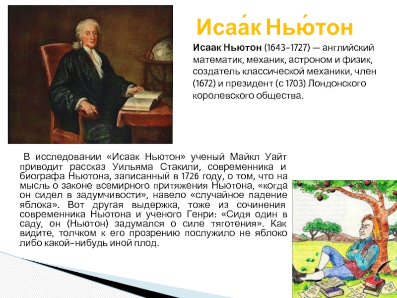 Исаак Ньютон (1643-1727) — английский математик, механик, астроном и физик, создатель классической механики, член (1672) и президент (с 1703) Лондонского королевского общества.