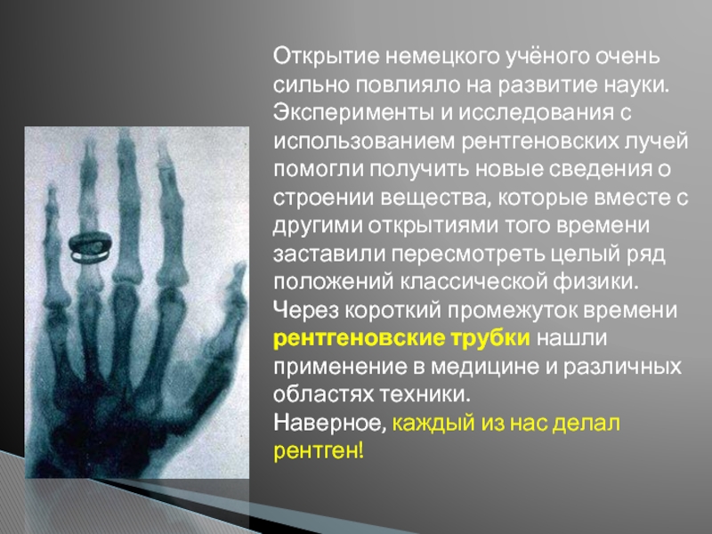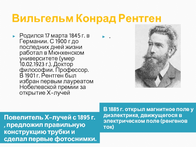 Родился 17 марта 1845 г. в Германии. С 1900 г до последних дней жизни работал в Мюнхенском университете (умер 10.02.1923 г.). Доктор философии. Профессор. В 1901 г. Рентген был избран первым лауреатом Нобелевской премии за открытие Х-лучей