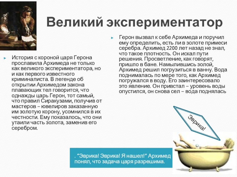 Герон вызвал к себе Архимеда и поручил ему определить, есть ли в золоте примеси серебра. Архимед 2200 лет назад не знал, что такое плотность. Он искал пути решения. Просветление, как говорят, пришло в бане. Намылившись золой, Архимед решил погрузиться в ванну. Вода поднималась по мере того, как Архимед погружался в воду. Его заинтересовало это явление. Он привстал – уровень воды опустился, он снова сел – вода поднялась