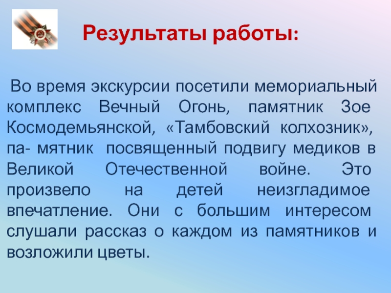 памятник Зое Космодемьянской, «Тамбовский колхозник», па- мятник посвященный подвигу медиков в Великой Отечественной войне. Это произвело на детей неизгладимое впечатление. Они с большим интересом слушали рассказ о каждом из памятников и возложили цветы.