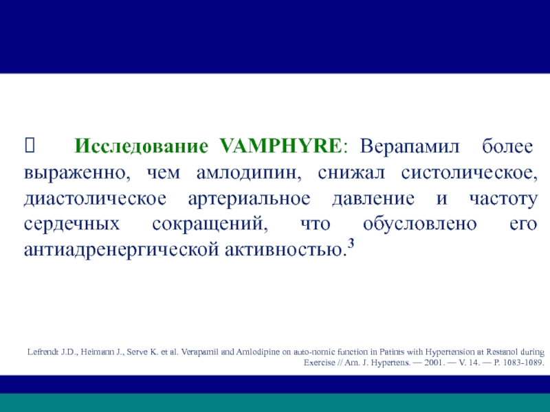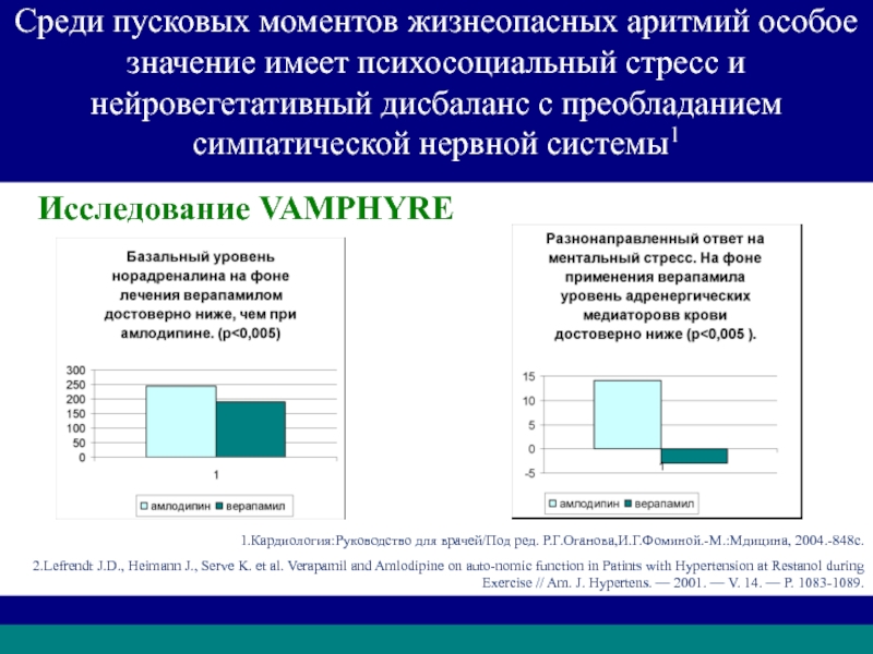 2.Lefrendt J.D., Heimann J., Serve K. et al. Verapamil and Amlodipine on auto-nomic function in Patints with Hypertension at Restanol during Exercise // Am. J. Hypertens. — 2001. — V. 14. — P. 1083-1089.