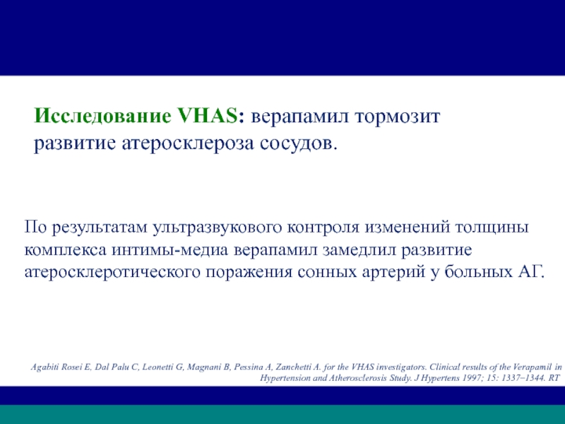 Agabiti Rosei E, Dal Palu C, Leonetti G, Magnani B, Pessina A, Zanchetti A. for the VHAS investigators. Clinical results of the Verapamil in Hypertension and Atherosclerosis Study. J Hypertens 1997; 15: 1337–1344. RT