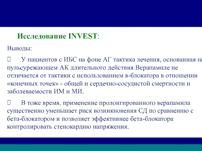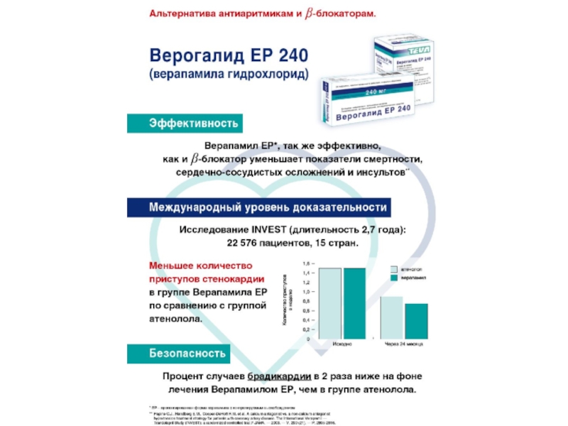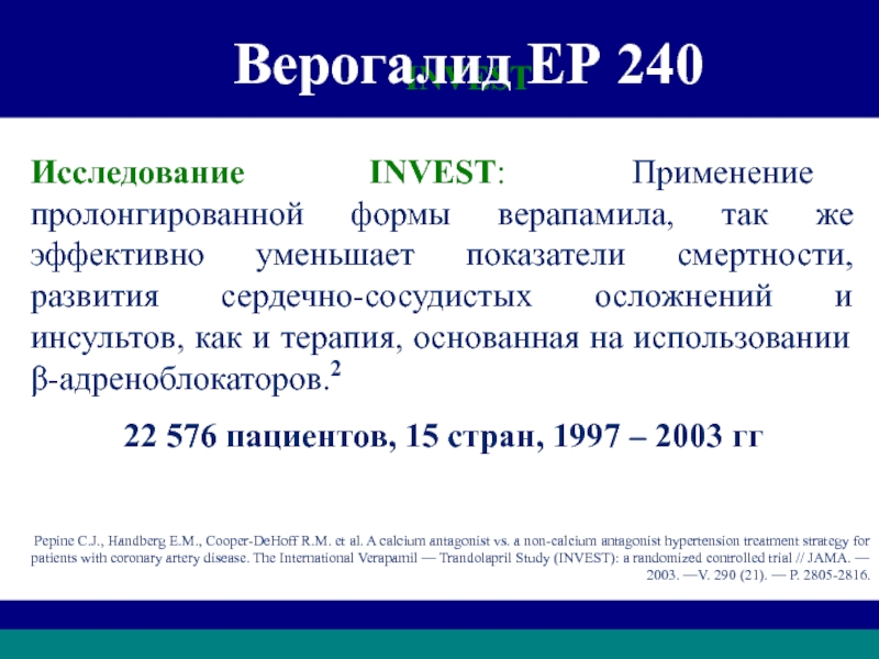 Pepine C.J., Handberg E.M., Cooper-DeHoff R.M. et al. A calcium antagonist vs. a non-calcium antagonist hypertension treatment strategy for patients with coronary artery disease. The International Verapamil — Trandolapril Study (INVEST): a randomized controlled trial // JAMA. — 2003. —V. 290 (21). — P. 2805-2816.