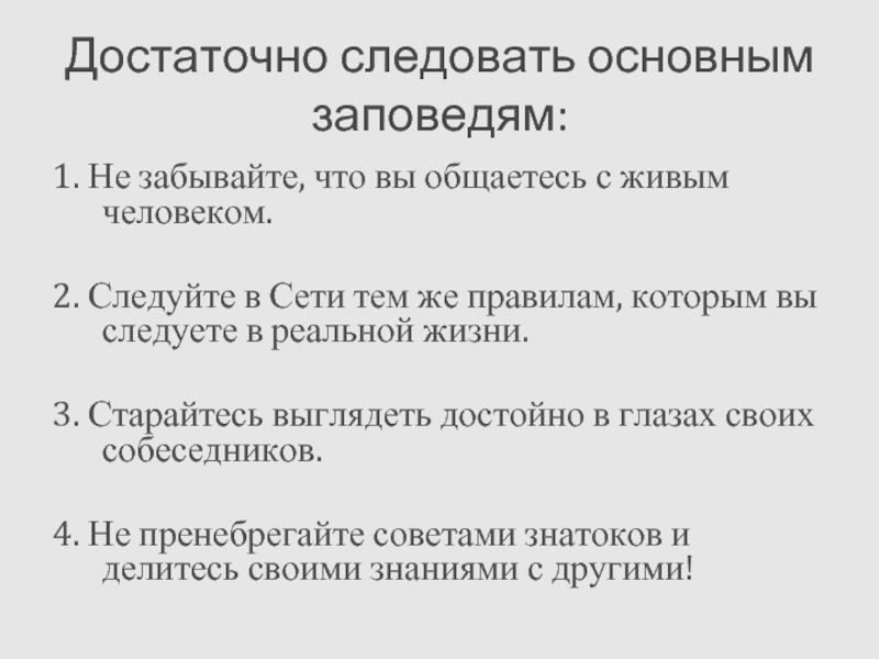 Слайд 6Достаточно следовать основным заповедям: