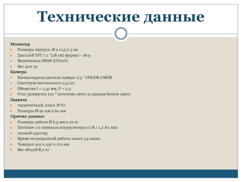 Устанавливается цветная камера. Диаметр камеры составляет 40 мм , что позволяет использовать видеоэндоскоп в самых труднодоступных местах. Зонд может менять свое положение: 180° в горизонтальной плоскости и 360° в вертикальной. Эндоскоп обладает высокой светочувствительностью, пыле- и брызгозащищен, а также прост в управлении.