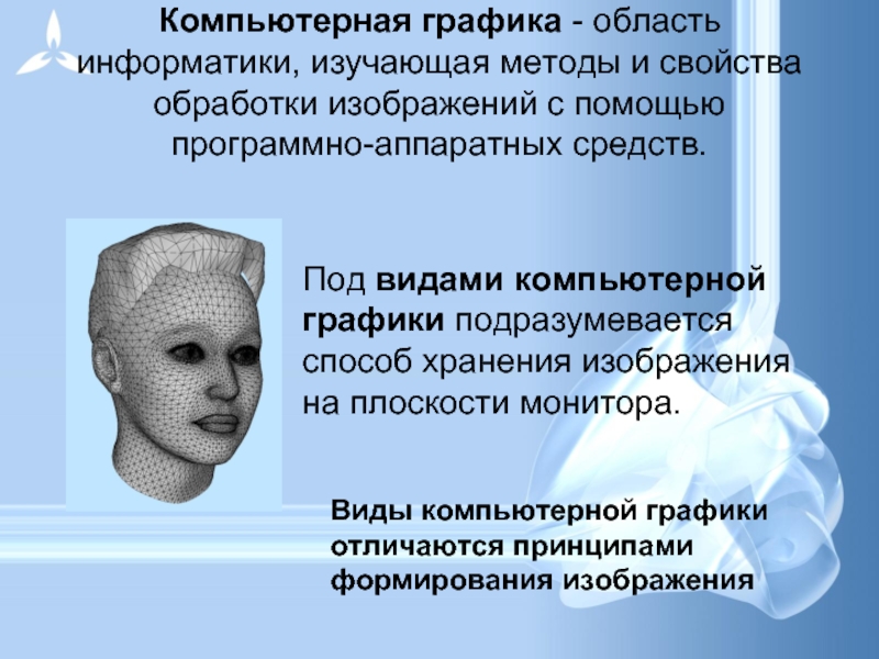 Под видами компьютерной графики подразумевается способ хранения изображения на плоскости монитора.
