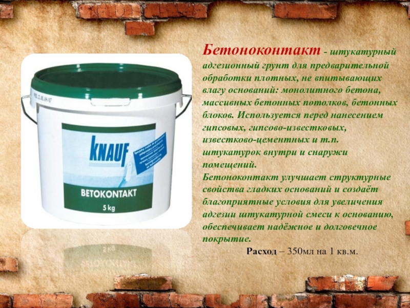 Слайд 3Бетоноконтакт - штукатурный адгезионный грунт для предварительной обработки плотных, не впитывающих влагу