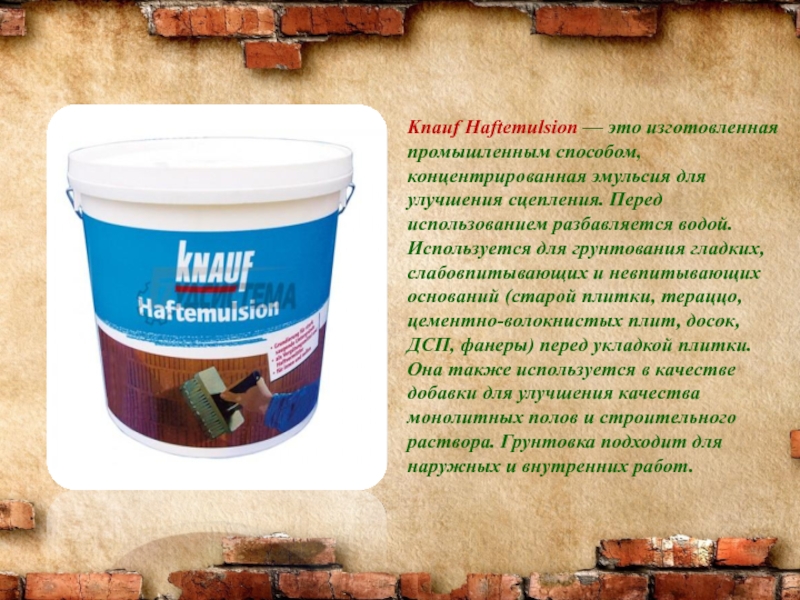 Слайд 9Knauf Haftemulsion — это изготовленная промышленным способом, концентрированная эмульсия для улучшения сцепления.