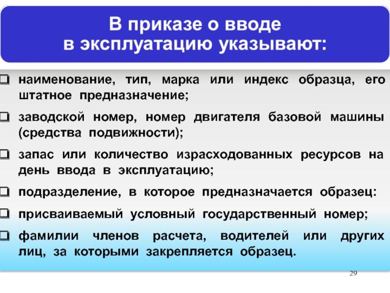 Слайд 29наименование, тип, марка или индекс образца, его штатное предназначение;
