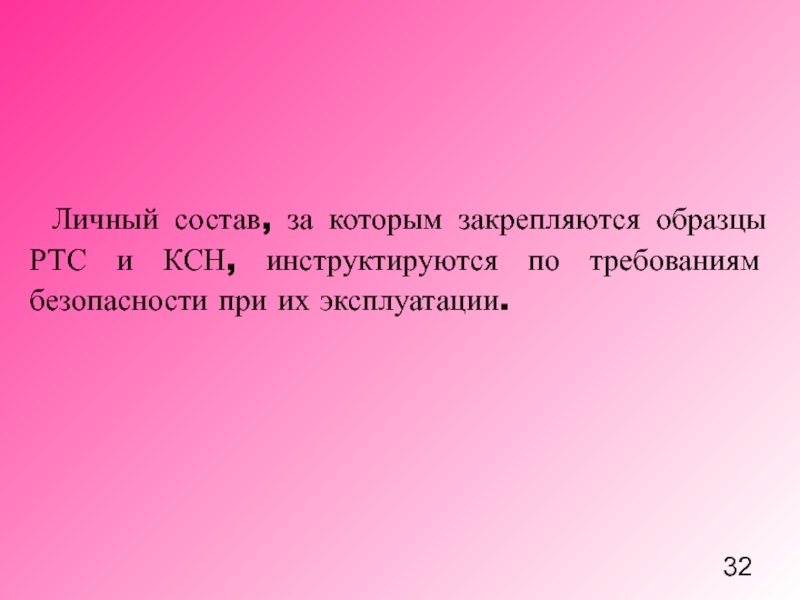 Слайд 32Личный состав, за которым закрепляются образцы РТС и КСН, инструктируются по