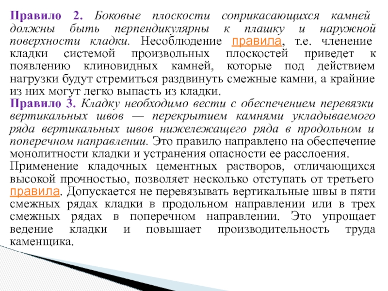 Слайд 13Правило 2. Боковые плоскости соприкасающихся камней должны быть перпендикулярны к плашку