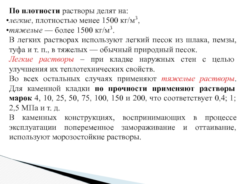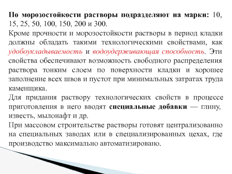 Слайд 9По морозостойкости растворы подразделяют на марки: 10, 15, 25, 50, 100,