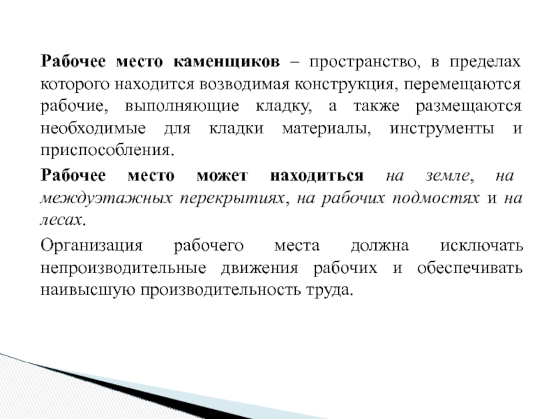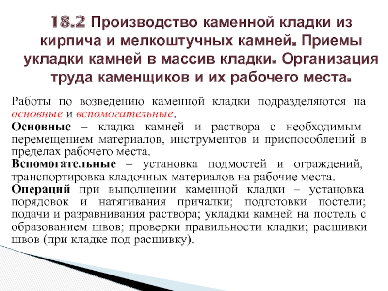 18.2 Производство каменной кладки из кирпича и мелкоштучных камней. Приемы укладки камней в массив кладки. Организация труда каменщиков и их рабочего места.