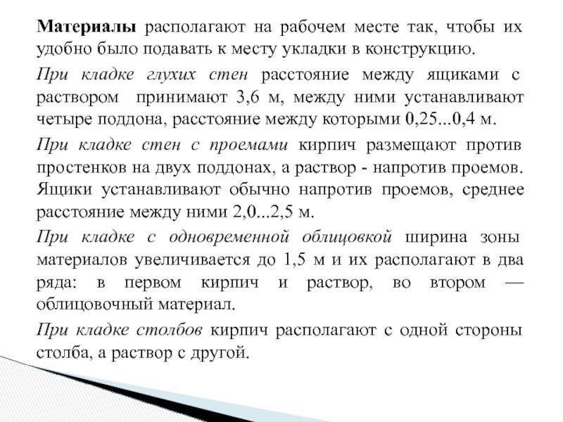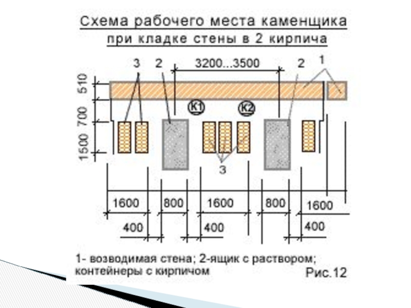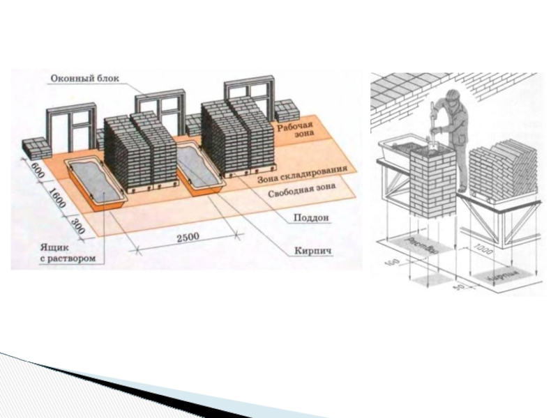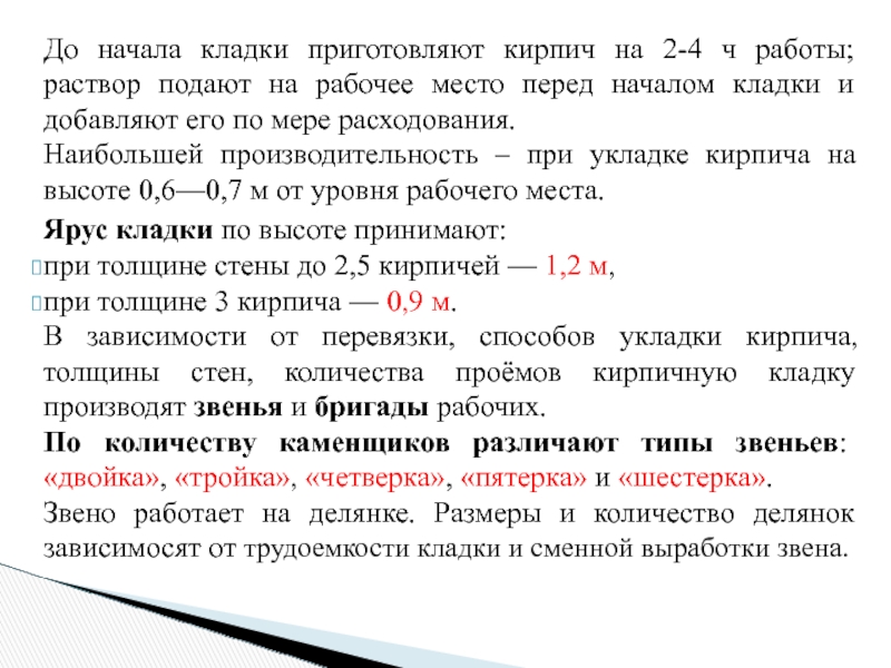 Наибольшей производительность – при укладке кирпича на высоте 0,6—0,7 м от уровня рабочего места.