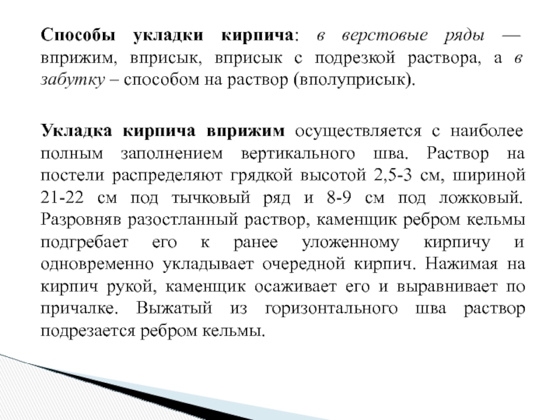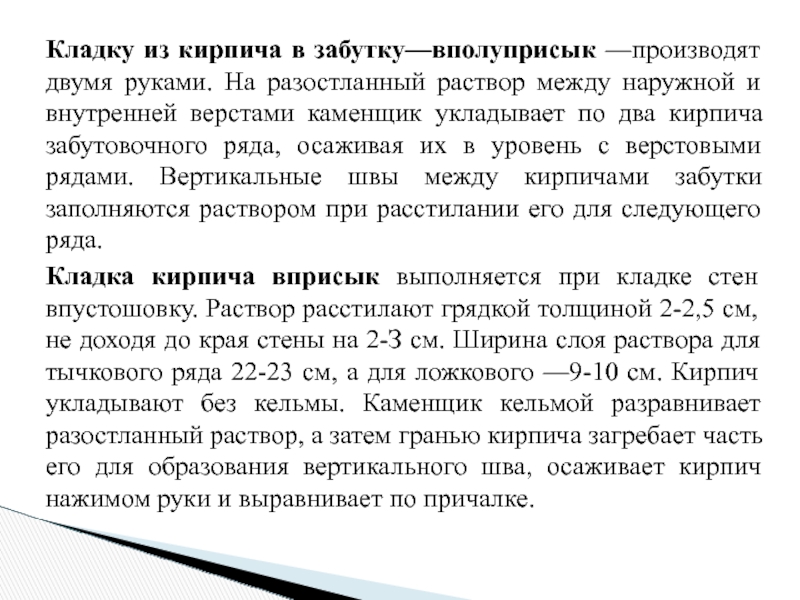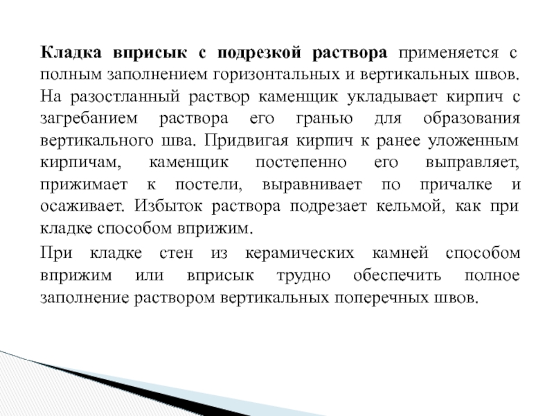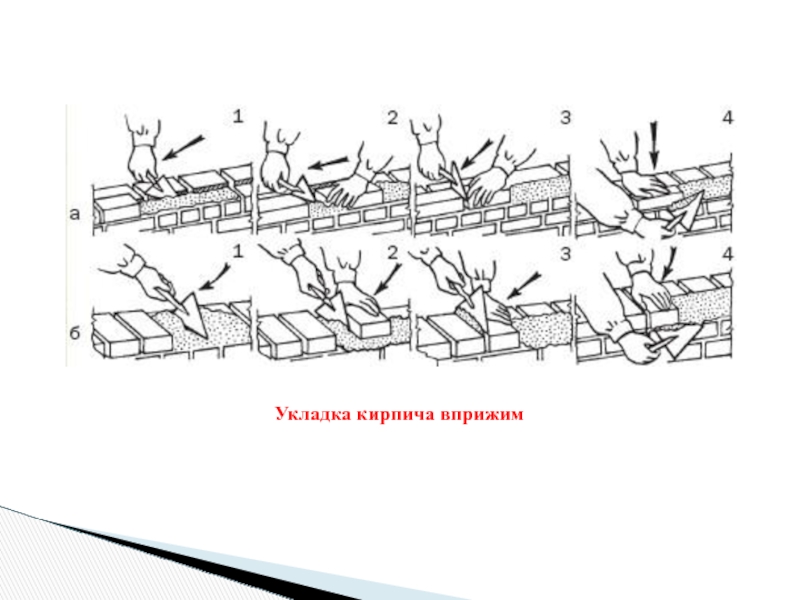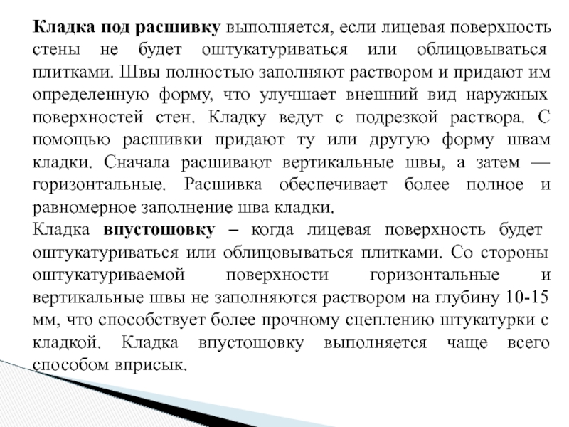 Слайд 11При кладке впустошовку швы с лицевой стороны не заполняют раствором на