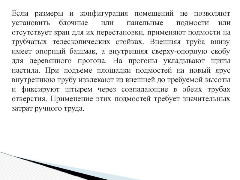 подмости или отсутствует кран для их перестановки, применяют подмости на трубчатых телескопических стойках. Внешняя труба внизу имеет опорный башмак, а внутренняя сверху-опорную скобу для деревянного прогона. На прогоны укладывают щиты настила. При подъеме площадки подмостей на новый ярус внутреннюю трубу извлекают из внешней до требуемой высоты и фиксируют штырем через совпадающие в обеих трубах отверстия. Применение этих подмостей требует значительных затрат ручного труда.