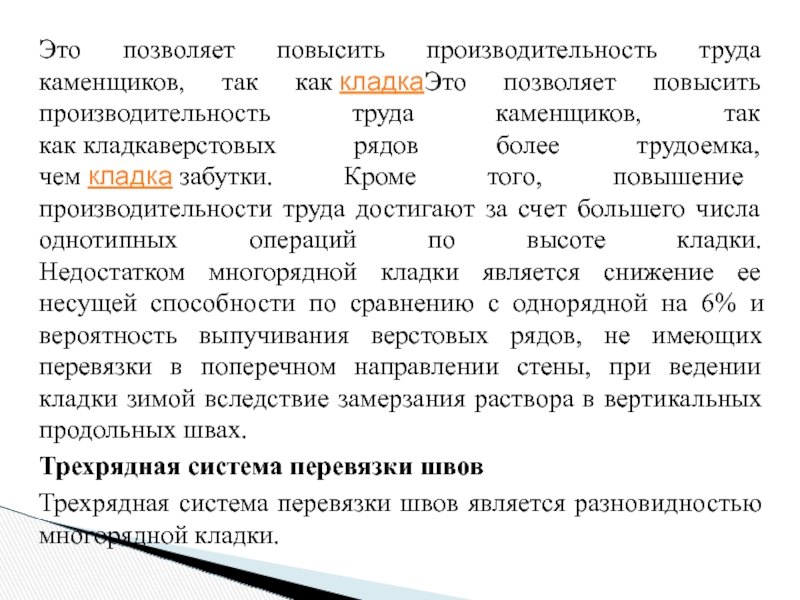 Слайд 20Это позволяет повысить производительность труда каменщиков, так как кладкаЭто позволяет повысить производительность