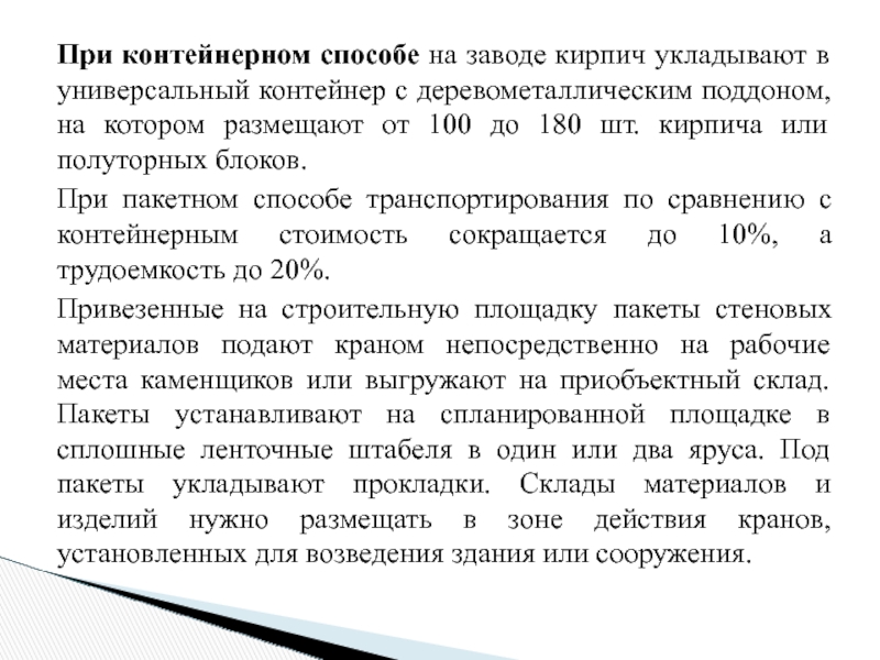 Слайд 59При контейнерном способе на заводе кирпич укладывают в универсальный контейнер с