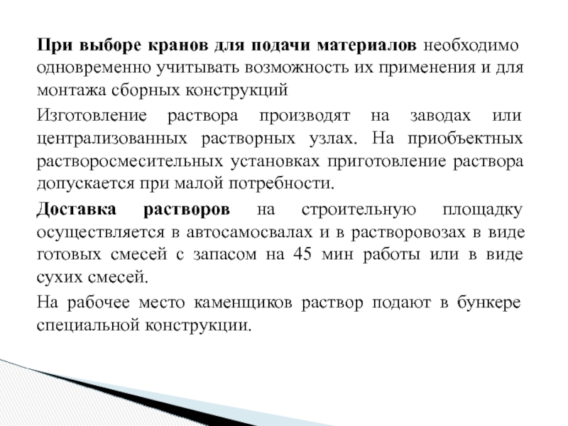 Слайд 60При выборе кранов для подачи материалов необходимо одновременно учитывать возможность их