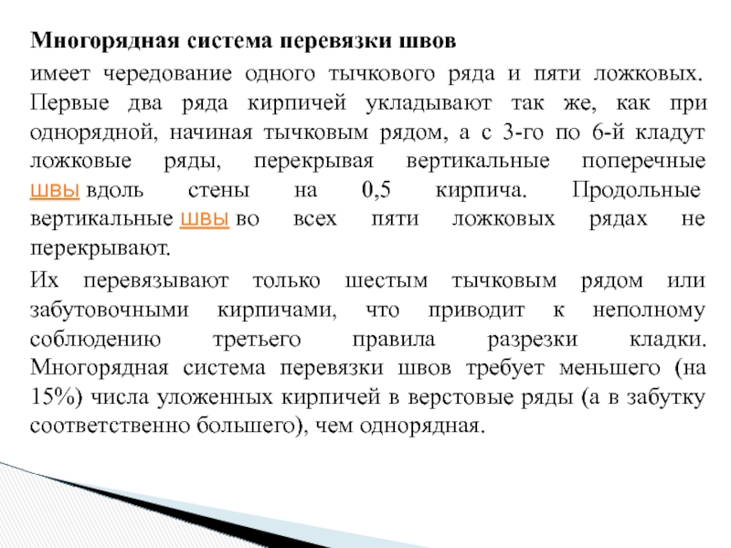 Многорядная система перевязки швов требует меньшего (на 15%) числа уложенных кирпичей в верстовые ряды (а в забутку соответственно большего), чем однорядная.
