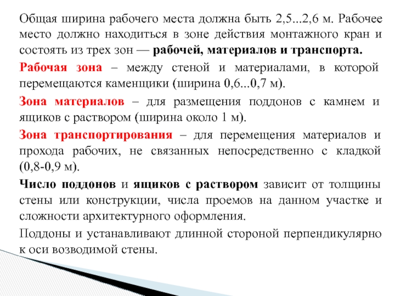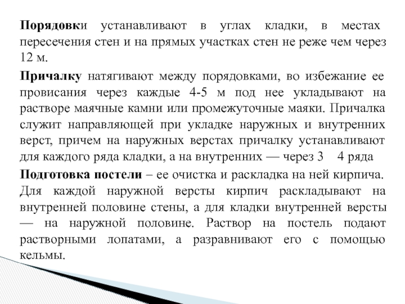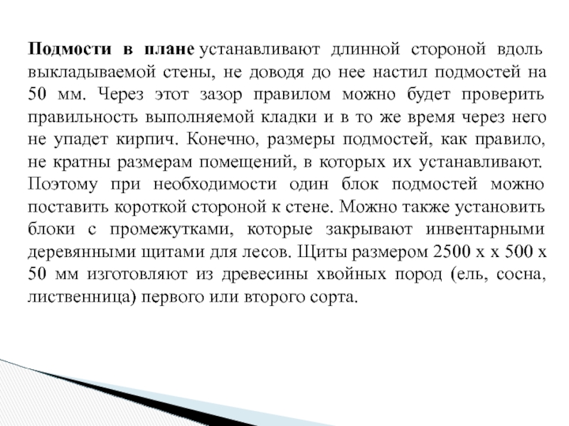 Слайд 47Подмости в плане устанавливают длинной стороной вдоль выкладываемой стены, не доводя до