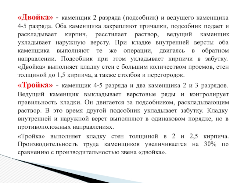 Слайд 38«Двойка» - каменщик 2 разряда (подсобник) и ведущего каменщика 4-5 разряда.